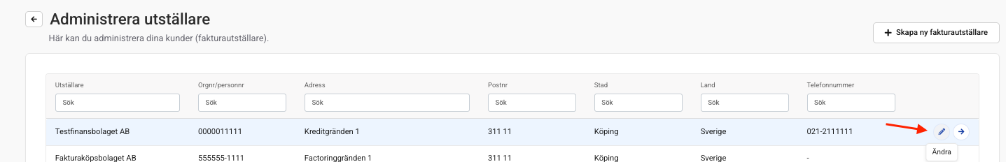Öppna för redigering: Sök upp utställaren och klicka på penn-symbolen.