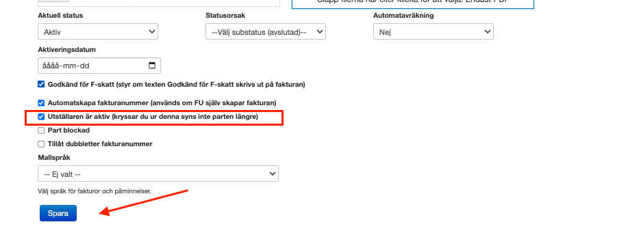 Inaktivera: Bocka ur alternativet "Utställaren är aktiv". Genom att avmarkera denna ruta döljs parten från systemets sökvyer.