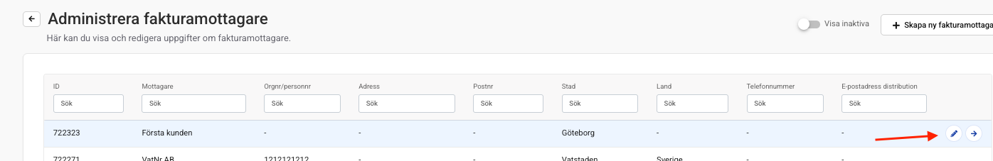 Öppna för redigering: Sök upp den aktuella mottagaren i listan och klicka på den lilla pennan för att redigera uppgifterna.