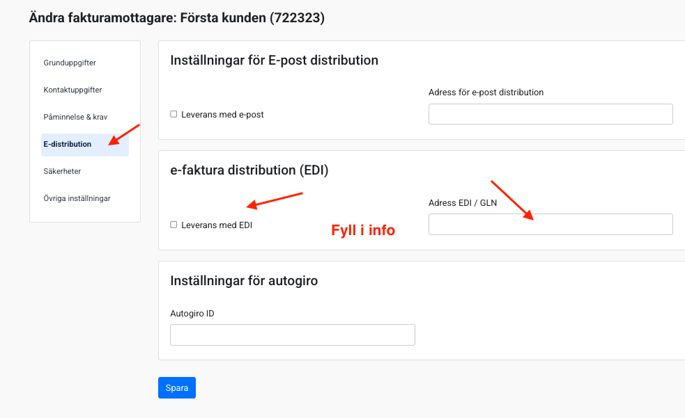 Aktivera E-distribution: Skrolla ner till sektionen Inställningar för elektronisk distribution (E-distribution).