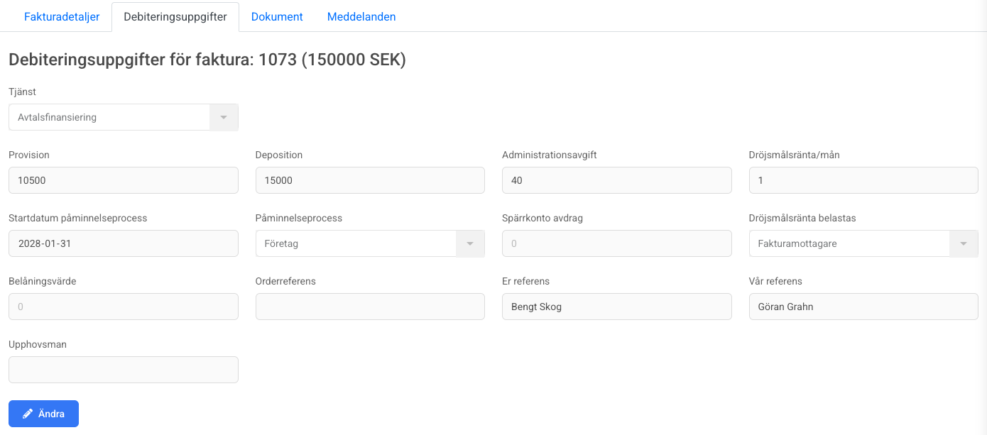 En kopia av den felaktiga fakturan skapas, som du sedan kan ändra enligt instruktionerna ovan (under fliken Debiteringsuppgifter) innan den avräknas på nytt.