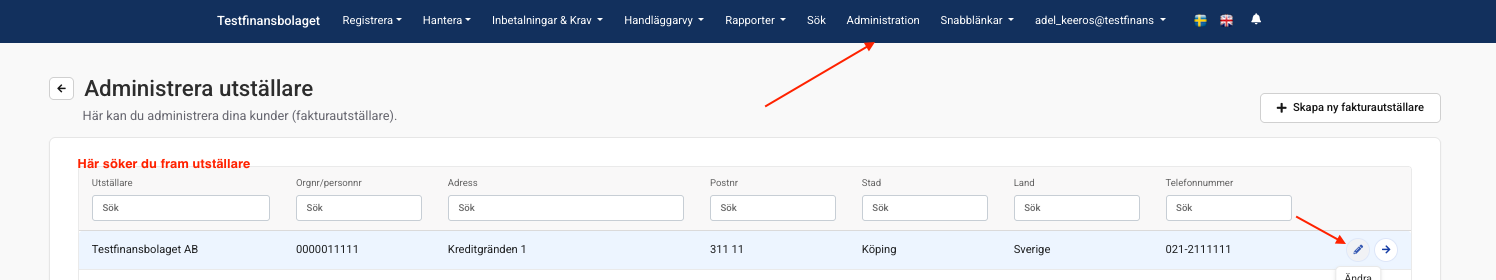 Öppna för redigering: Sök upp den aktuella kunden/utställaren i listan och klicka på den lilla pennan för att öppna redigeringsläget.