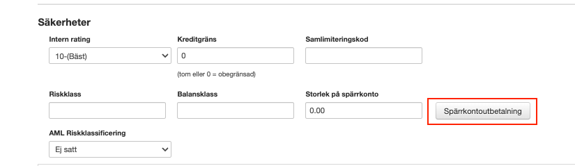 Registrera utbetalning: Scrolla ner till sektionen Säkerheter. Där finner du knappen Spärrkontoutbetalning.