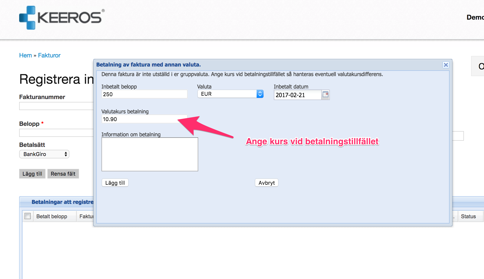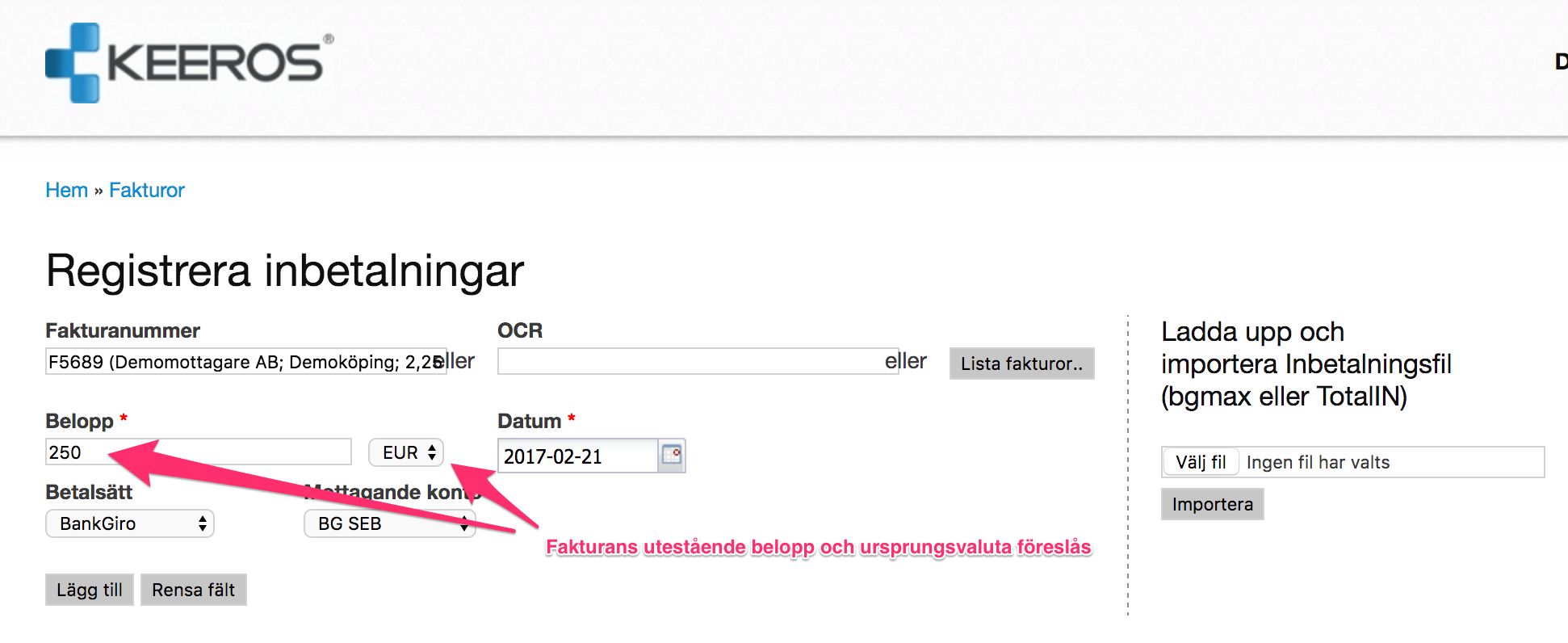 Systemet föreslår utestående belopp samt fakturans registrerade valuta. I exemplet ovan 250 EUR.