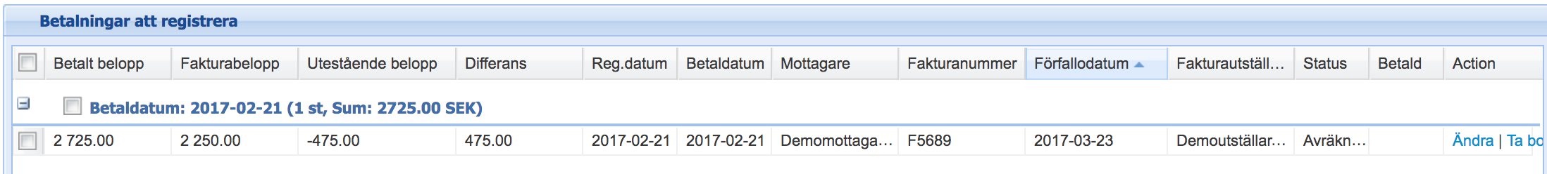 Du söker upp fakturan som vanligt i vyn för att registrera inbetalningar.