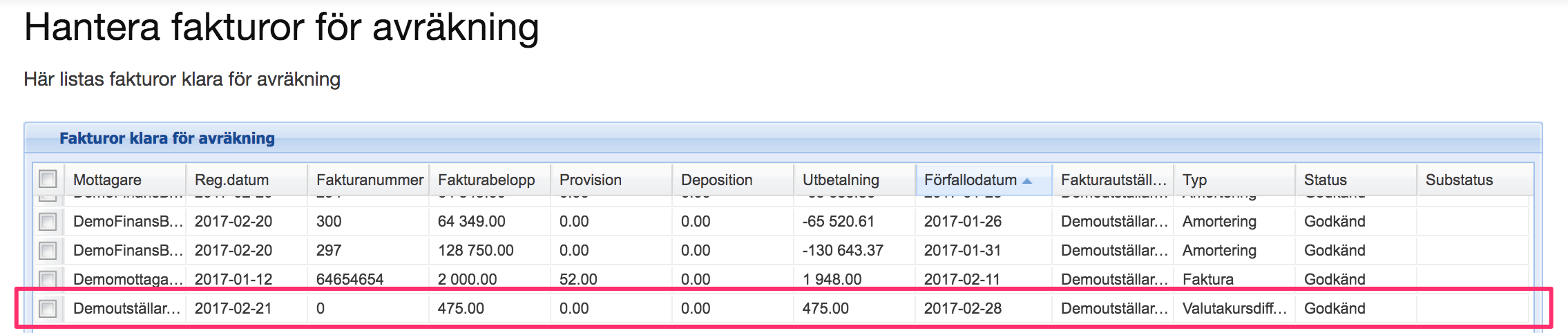 Om det uppstår en valutakursdiff, positiv eller negativ, så skapas en post i avräkningsvyn för att kompensera klienten (utställaren) för denna.