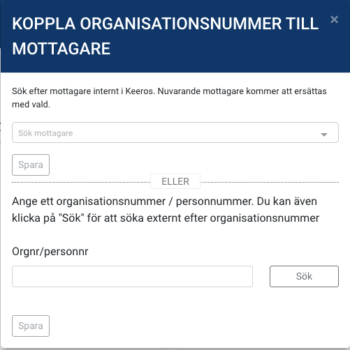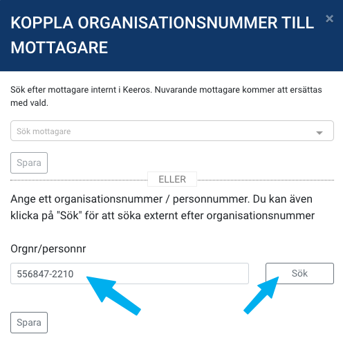 3. Skriv organisationsnumret på den aktuella mottagare eller sök.