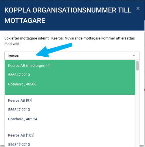 3. Skriv företagsnamnet på mottagaren i rutan som pilen pekar på, alla mottagare som matchar sökningen visas med sina organisationsnummer.