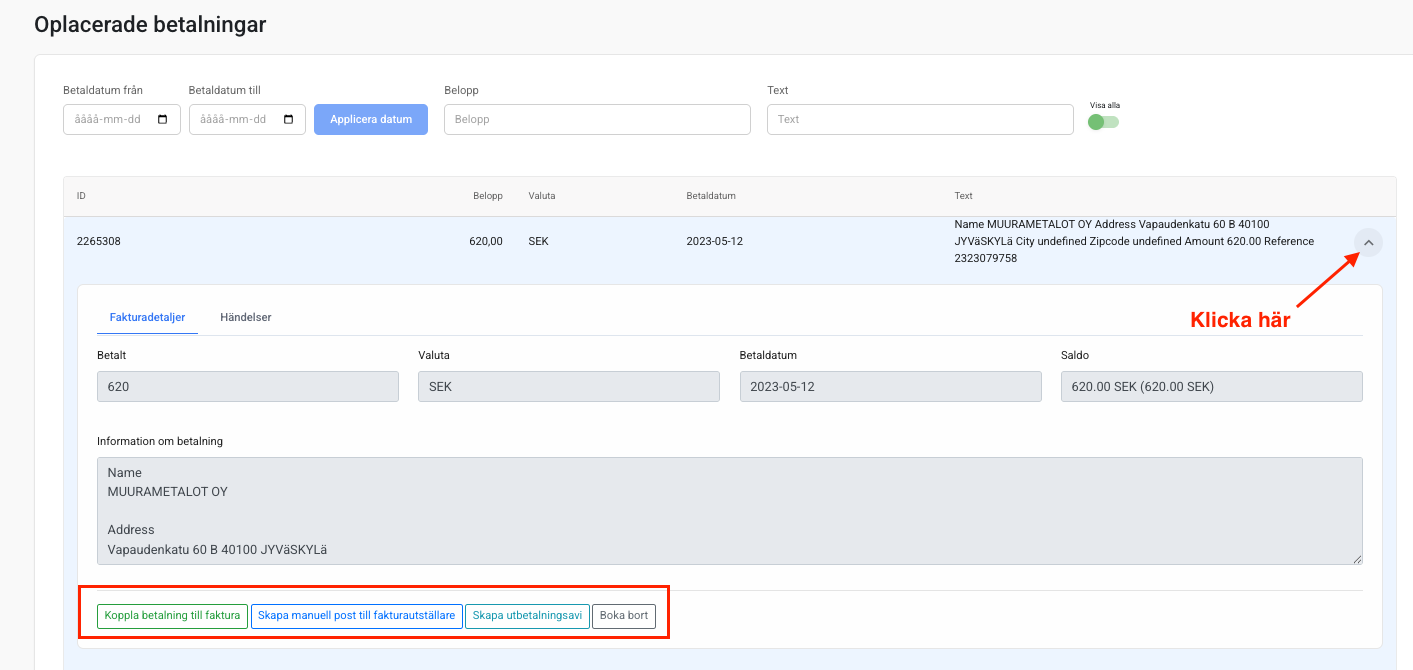 Om du klickar på en specifik betalning i listan får du upp mer information och en händelselogg som visar vad som hänt sedan den registrerades. Du ser här både det ursprungliga beloppet och nuvarande saldo (om delar av summan redan har placerats).