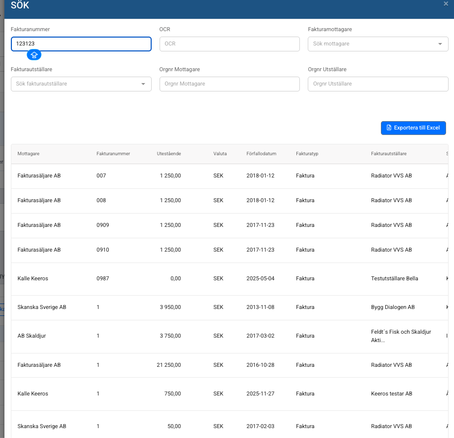 • Sök upp fakturan du vill placera beloppet mot (t.ex. faktura 123).