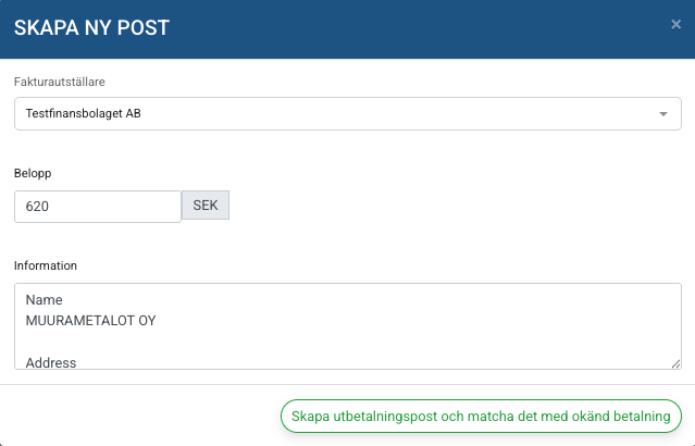 • Tryck på knappen Skapa manuell post mot fakturautställare.