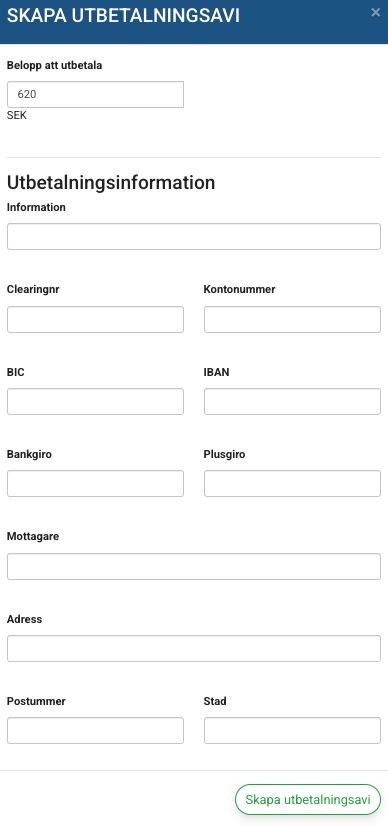 • Notera: Ingen utbetalning sker automatiskt från banken; du använder avin som underlag för manuell betalning eller via utbetalningsfil.