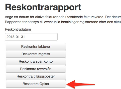 Alla oplac betalningar har ett utestående saldo och summan av detta saldo utgör totala reskontran. För att stämma av denna reskontra används rapporten Rapporter->Reskontrarapport där avstämningsdatum anges och sedan körs rapporten.
