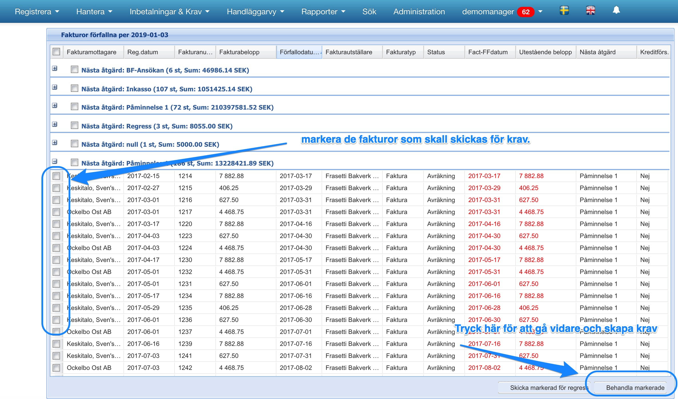 Tänk på att alltid registrera in alla betalningar innan ni går in och jobbar med krav så att alla fakturor är uppdaterade.