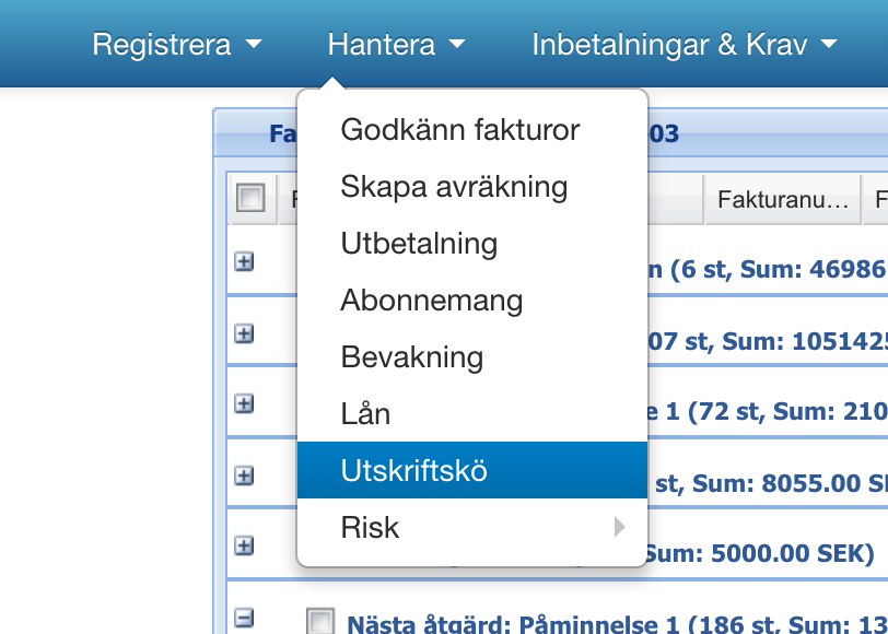 I vyn för påminnelser & inkasso så grupperas alla fakturor efter nästa föreslagna status baserat på kravprocessen. Om det är många fakturor som ligger för behandling så rekommenderar vi att ni behandlar en typ åt gången, dvs först påminnelser1 därefter inkasso osv. Detta för att det ska bli lättare för er att hantera om det skulle bli fel i hanteringen.