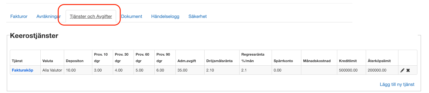 Klicka på den lilla pennan för att öppna upp redigeringsläge på den tjänst för vilken du vill lägga till en regresslimit. Normalt är detta för tjänsten Fakturaköp som exemplet ovan.