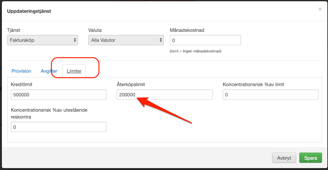 Klicka på fliken Limiter där du hittar fältet Återköpslimit