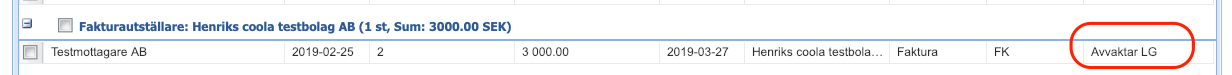 Nedan ser vi exempel på en faktura där vi avvaktar leveransgodkännande och som således normalt inte kan godkännas och avräknas.