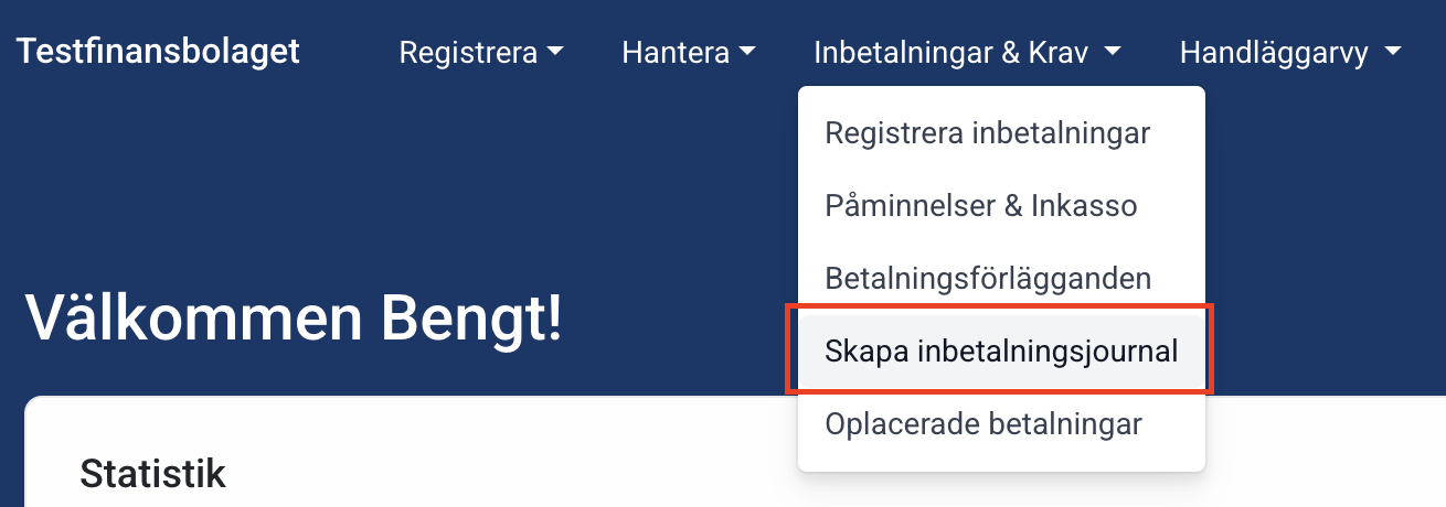 När betalningar har registrerats behöver ni skapa ett underlag för er bokföring. Detta gör ni under menyvalet Inbetalningar & krav --> Skapa inbetalningsjournal