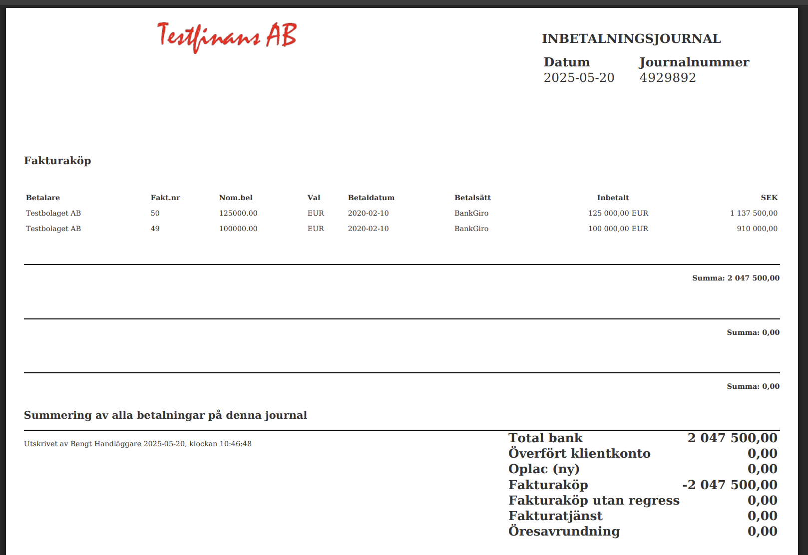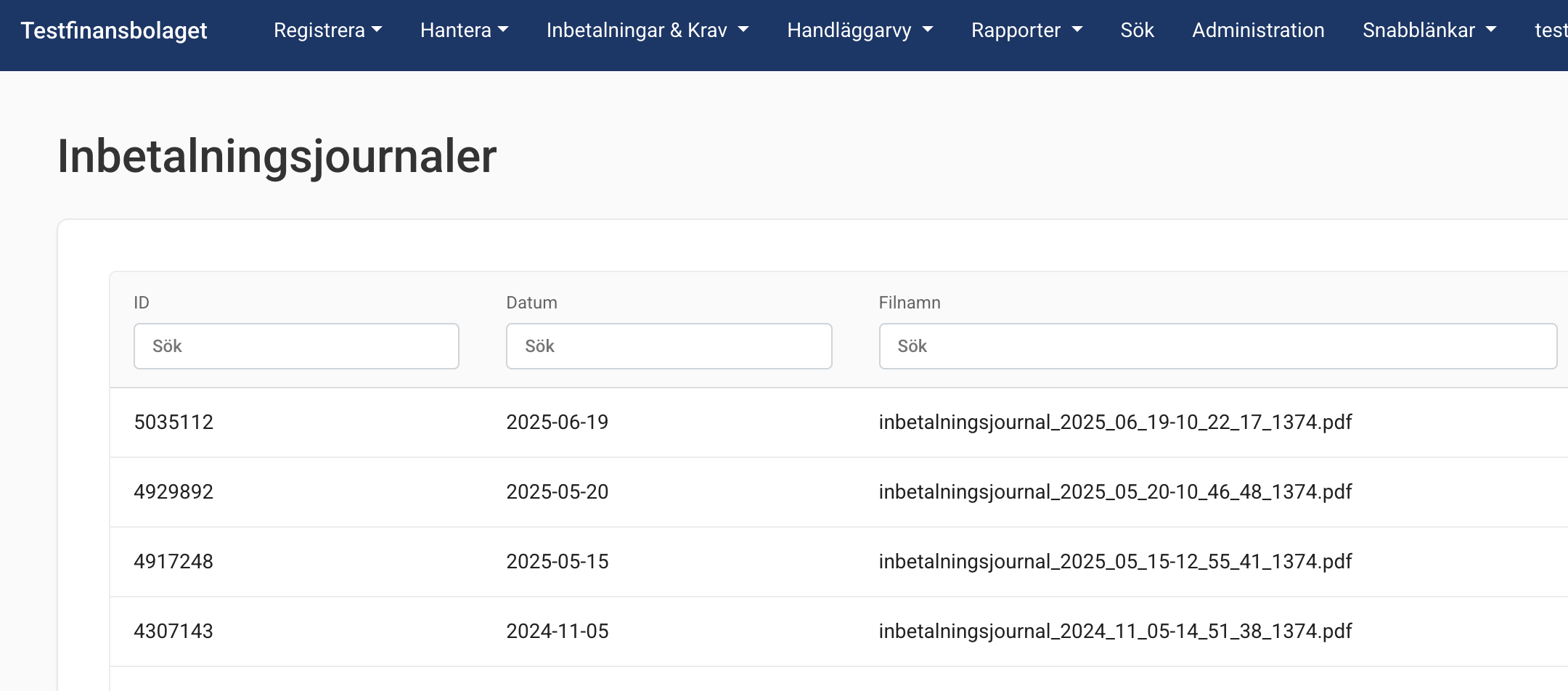 Systemet skapar en fil som underlag för bokföring. Inbetalningsjournalen får ett journalnummer som återfinns i systemet för spårbarhet.