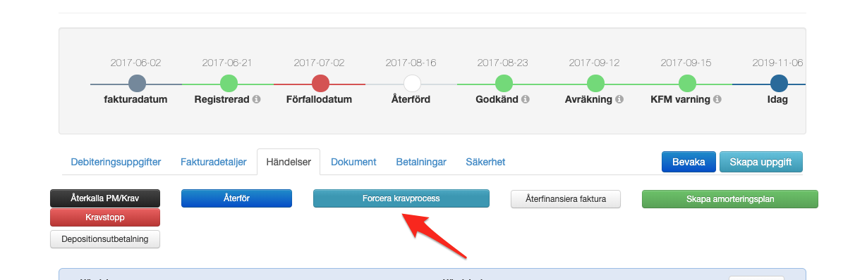 Sök upp och markera fakturan i Handläggaryn och tryck på knappen Forcera kravprocess.