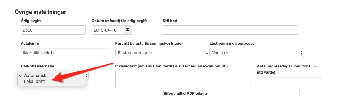 Om du vill tvinga systemet att alltid skriva ut en viss utställares fakturor lokalt behöver du tala om för systemet att denna utställares fakturor inte skall skickas ut externt. Detta gör du genom att gå in på utställaren under Administration->Utställare. Välj pennan för att redigera kunden. Gå ner till Övriga inställningar och fältet som heter Utskriftsalternativ, där väljer du Lokal print