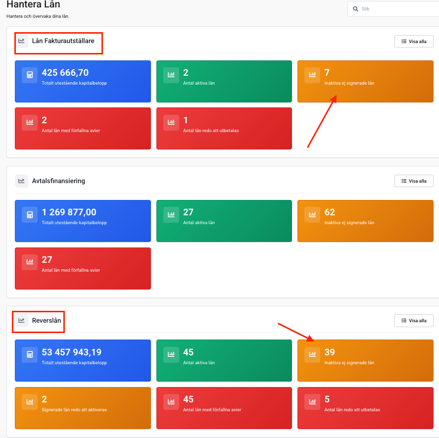 Registrerade men ännu ej aktiva lån hittar du genom att klicka på den gula "boxen" i översikten.