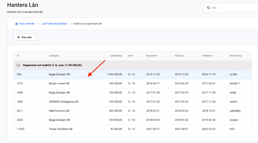 Klicka på den rad som motsvarar det lån du vill arbeta med.