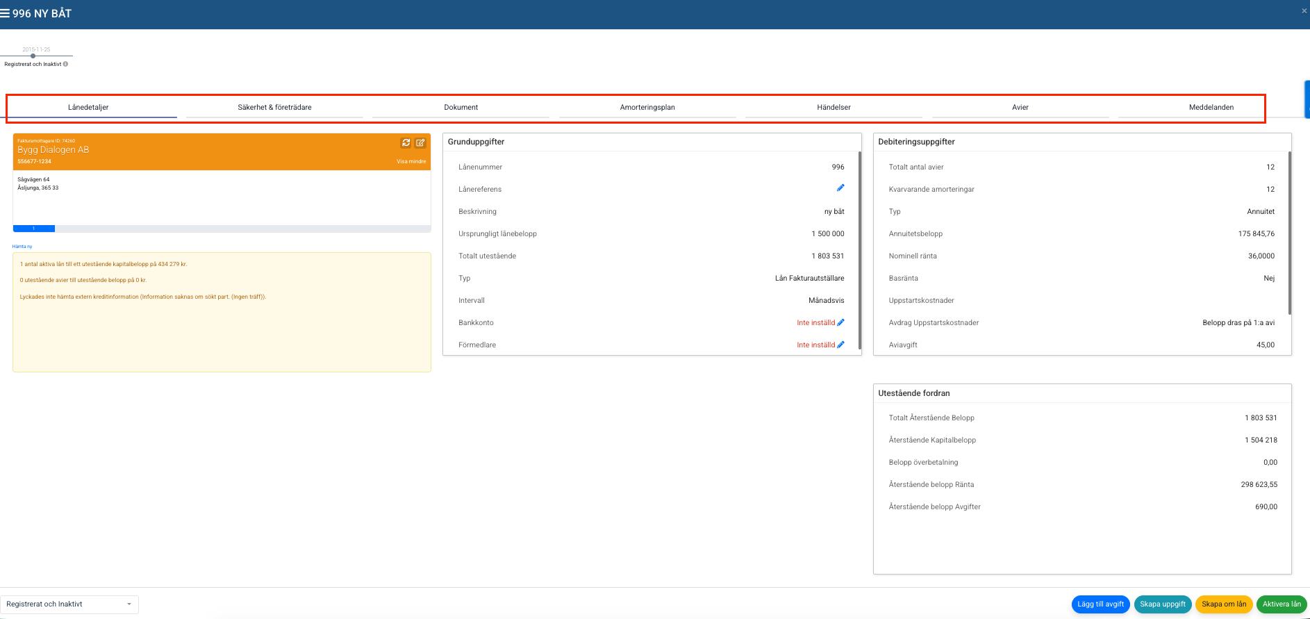 När du har öppnat lånet visas de registrerade uppgifterna. Medan de flesta grundläggande lånedetaljer är låsta för redigering, kan du lägga till och ändra information under de kompletterande flikarna.