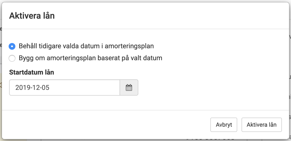 Klicka på Aktivera. En popup-ruta visas där du ska välja lånets startdatum: