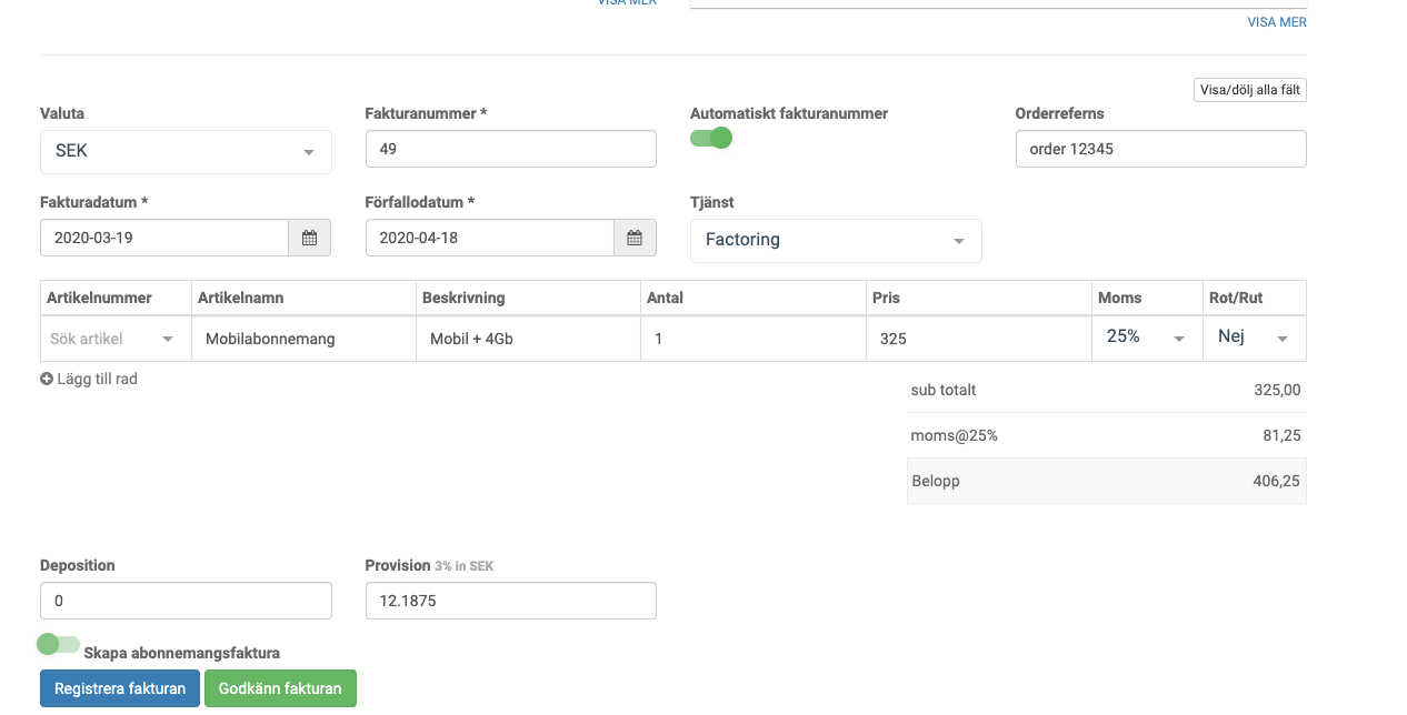 Nu skapar du mallfakturan precis som du vill att den sedan ska se ut löpande. I det här fallet är det debitering för ett mobilabonnemang för 325 kr i månaden.