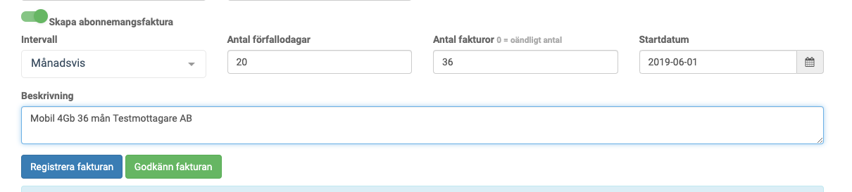 När du är nöjd med hur fakturan ser ut så väljer du att markera att detta skall vara en abonnemangsfaktura