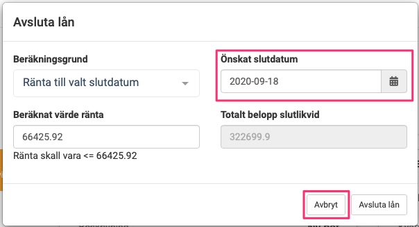 Här väljer du Önskat slutdatum till det datumet när lånet skall avslutas.