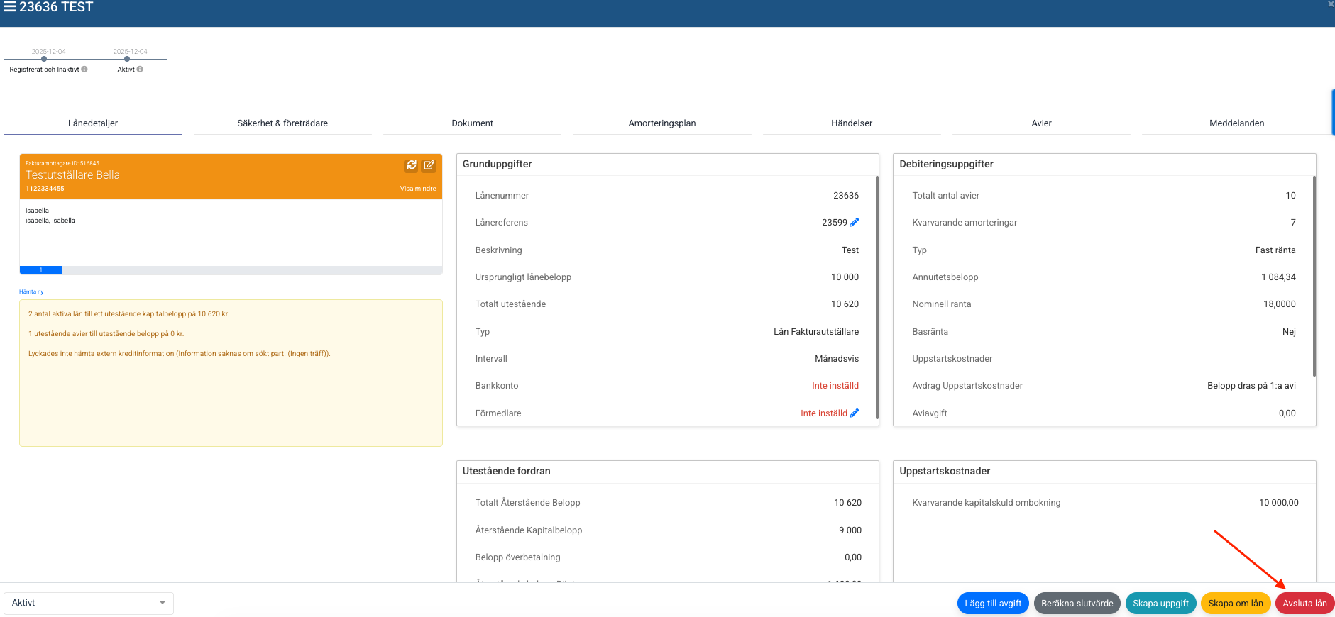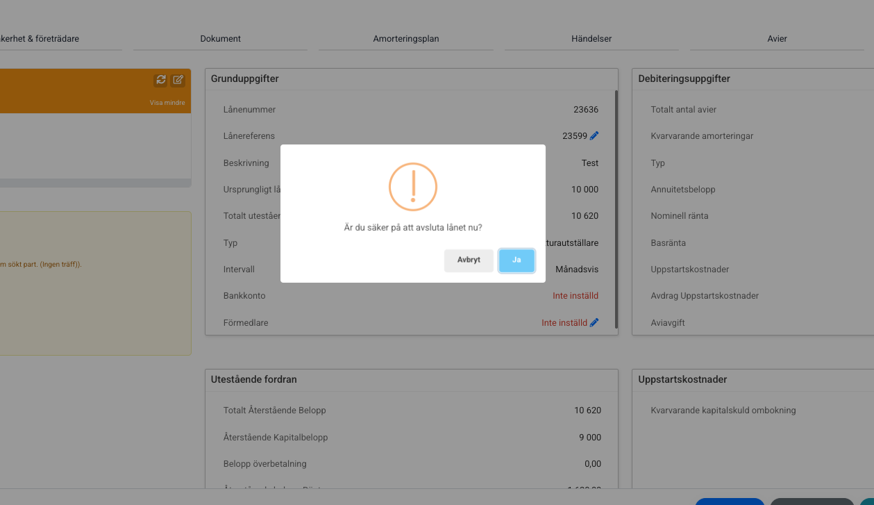 Slutavi skapas: När du väljer att avsluta lånet genererar systemet automatiskt en slutavi. Denna avi fungerar som underlag för den totala slutbetalningen.