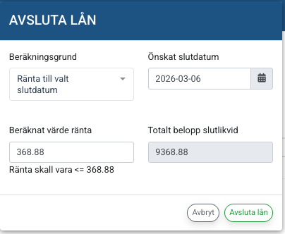 Systemet presenterar nu det exakta beloppet i fältet Totalt belopp slutlikvid. Detta belopp inkluderar restkapital, upplupen ränta och eventuella avgifter.