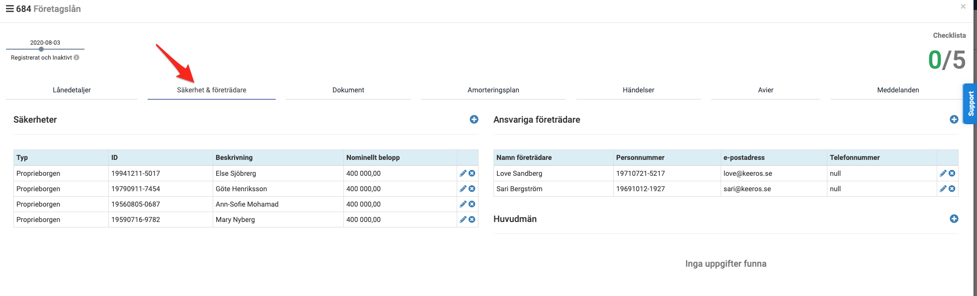 Gå till fliken Säkerhet & Företrädare på det aktuella lånet.