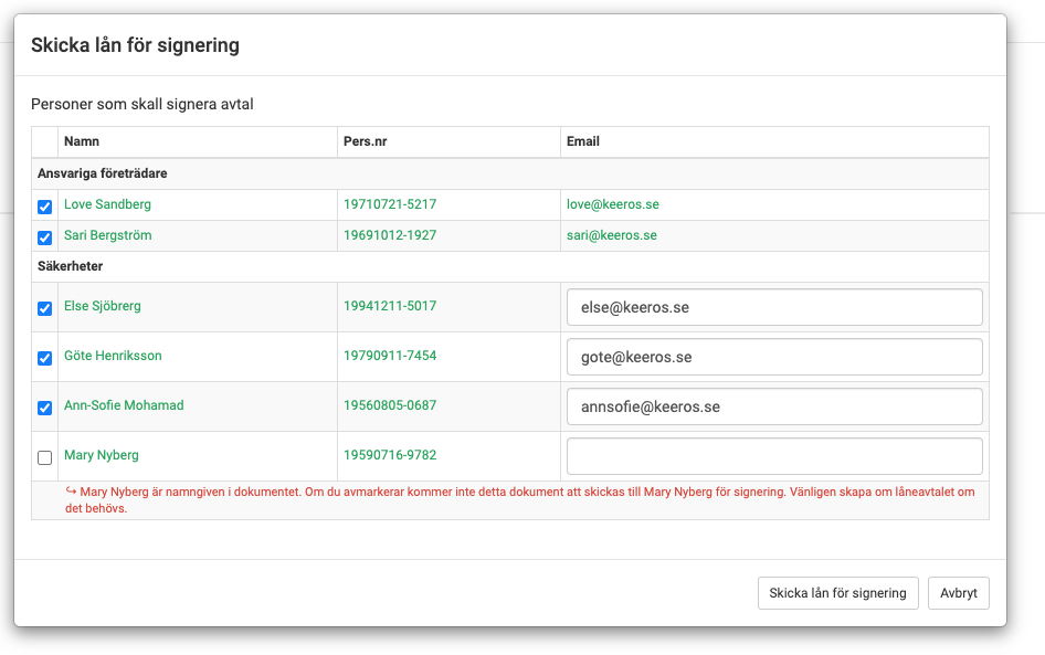 Välj mottagare: Som standard är alla parter förvalda. Om någon person (t.ex. en medsökande som inte ska stå på just detta avtal) inte ska signera, avmarkerar du rutan till vänster om namnet.