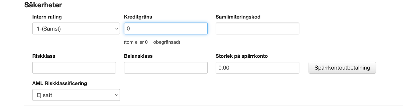 Scrolla ner till sektionen Säkerhet (eller Säkerheter) för att hitta fältet Kreditgräns.