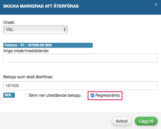 När ni köper fakturan då betalar utställaren provision för fakturan vilket är baserat på antal dagar fram till förfallodatum. Om fakturamottagaren inte betalar fakturan i tid och ni vill regressa fakturan mot utställaren kan ni välja att aktivera regressränta (se bild). Det innebär att ni kommer debitera utställaren för tiden från förfallodatum tills dess att ni valt att aktivt återdebitera fakturan mot utställaren.