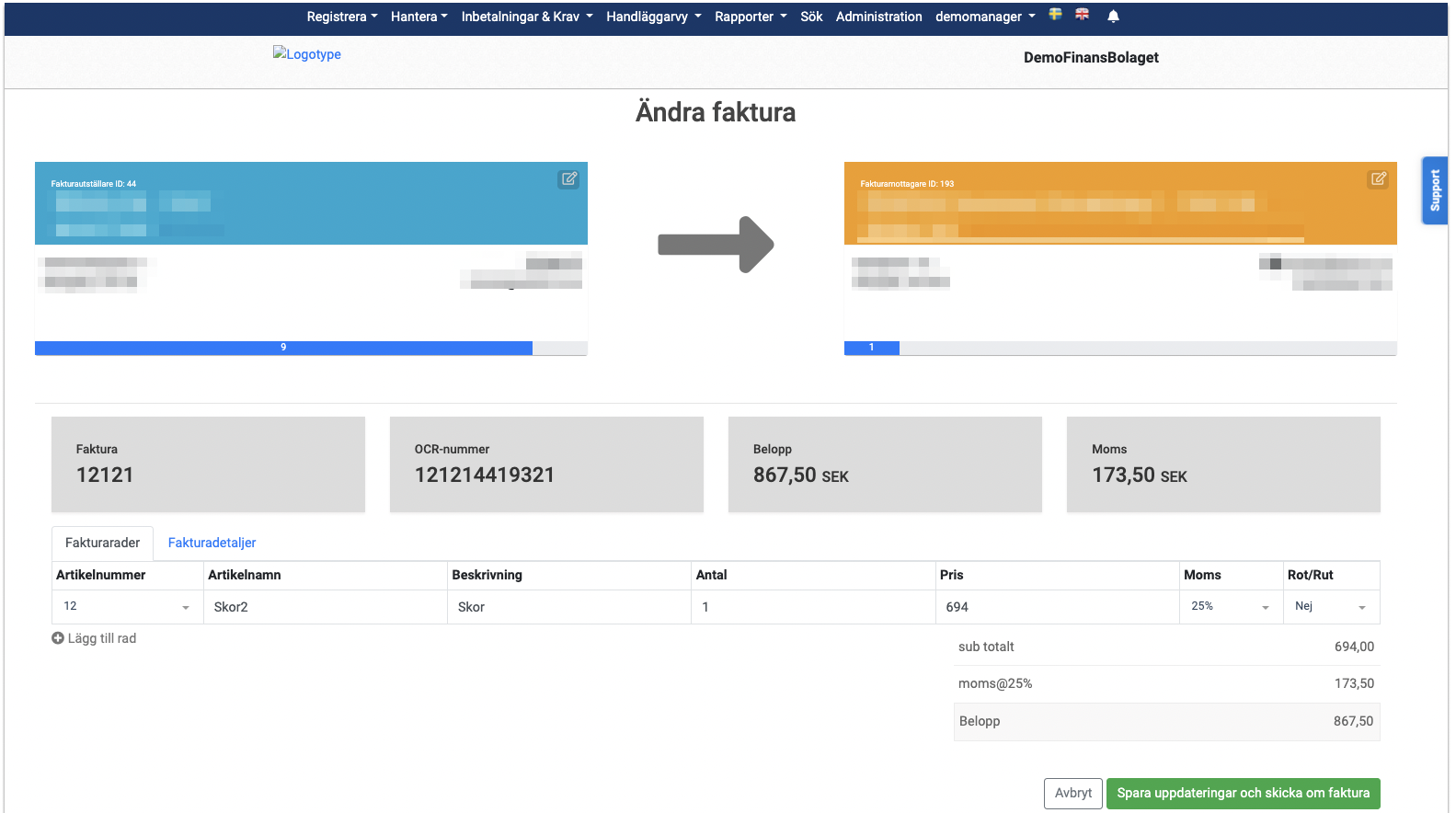 I detta e-postmeddelande kommer även med en länk som ni kan klicka på för att komma till en sida där ni själva kan justera till angivet fel om så är möjligt samt också skicka om fakturan.