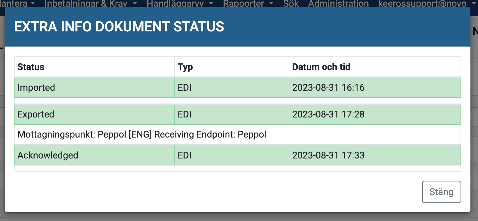 Viktigt att veta: Det är inte alla mottagarsystem som har stöd för att skicka tillbaka en "Acknowledged"-status. Om du ser Exported och ingen felrapport har inkommit, har fakturan nått mottagarens operatör och är på väg in i deras system.