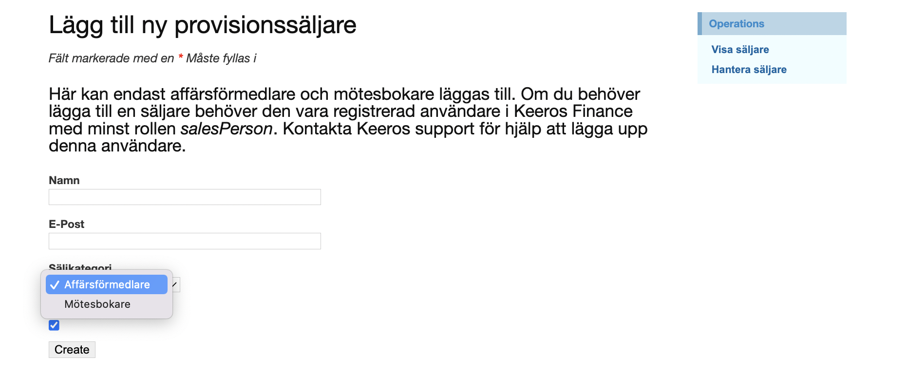 Provisionssäljare kan du inte lägga till själv, de behöver läggas upp som användare i tjänsten. Kontakta Keeros support för att få hjälp med dessa.