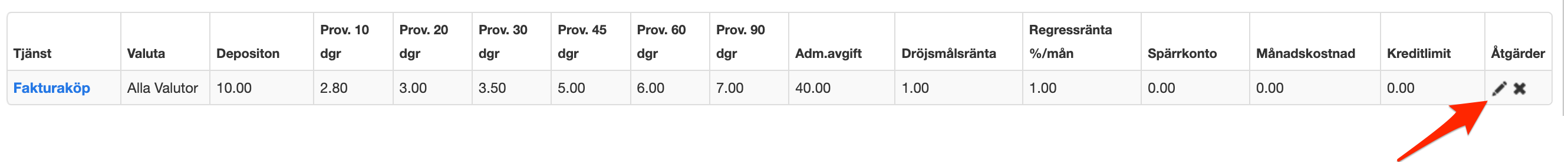 Sök upp aktuell fakturautställare och den tjänst du vill ändra. Klicka på den lilla pennan för att ändra tjänsten.