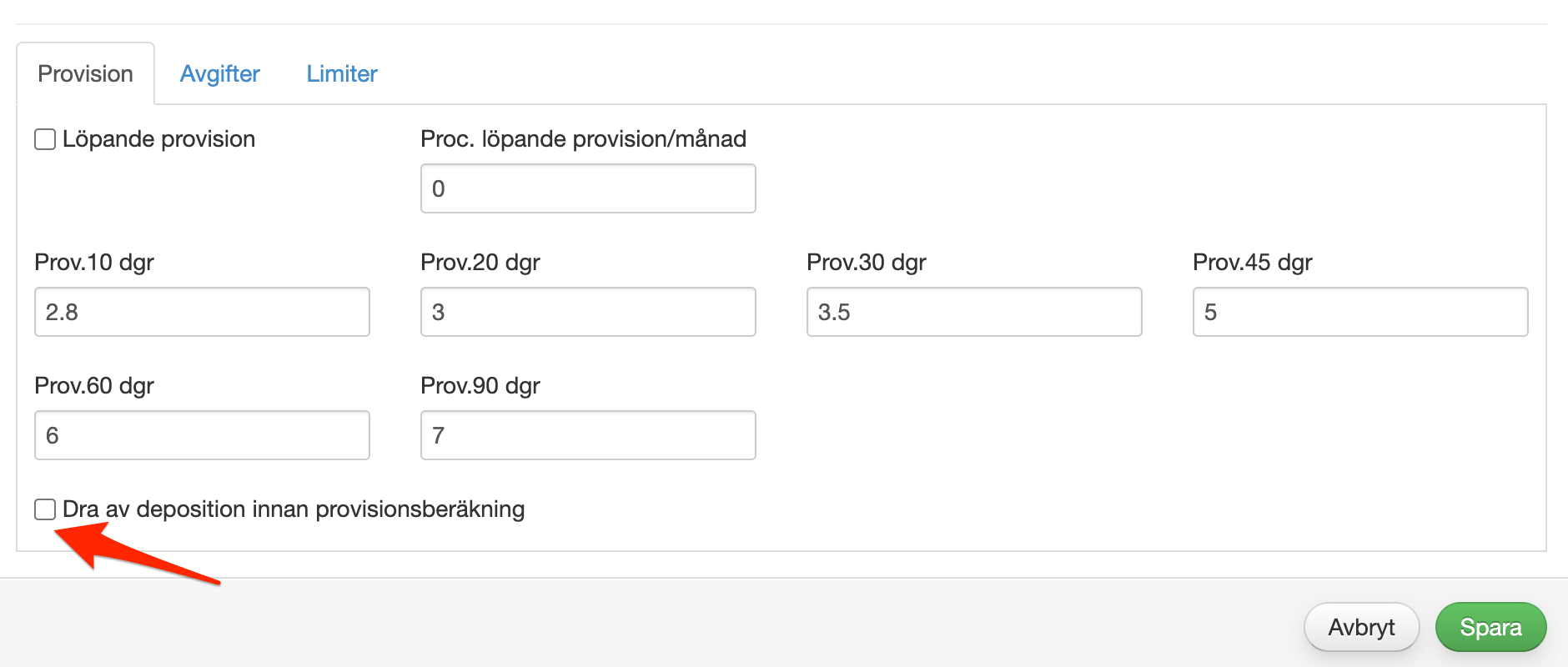 Om ni valt att dra av deposition innan beräkning kommer istället provisionsbeloppet baseras på 10 000 (fakturabelopp) - 1 000 (deposition) = 9 000