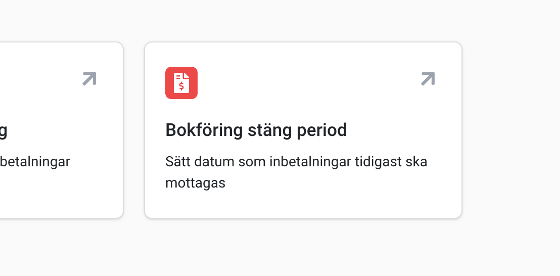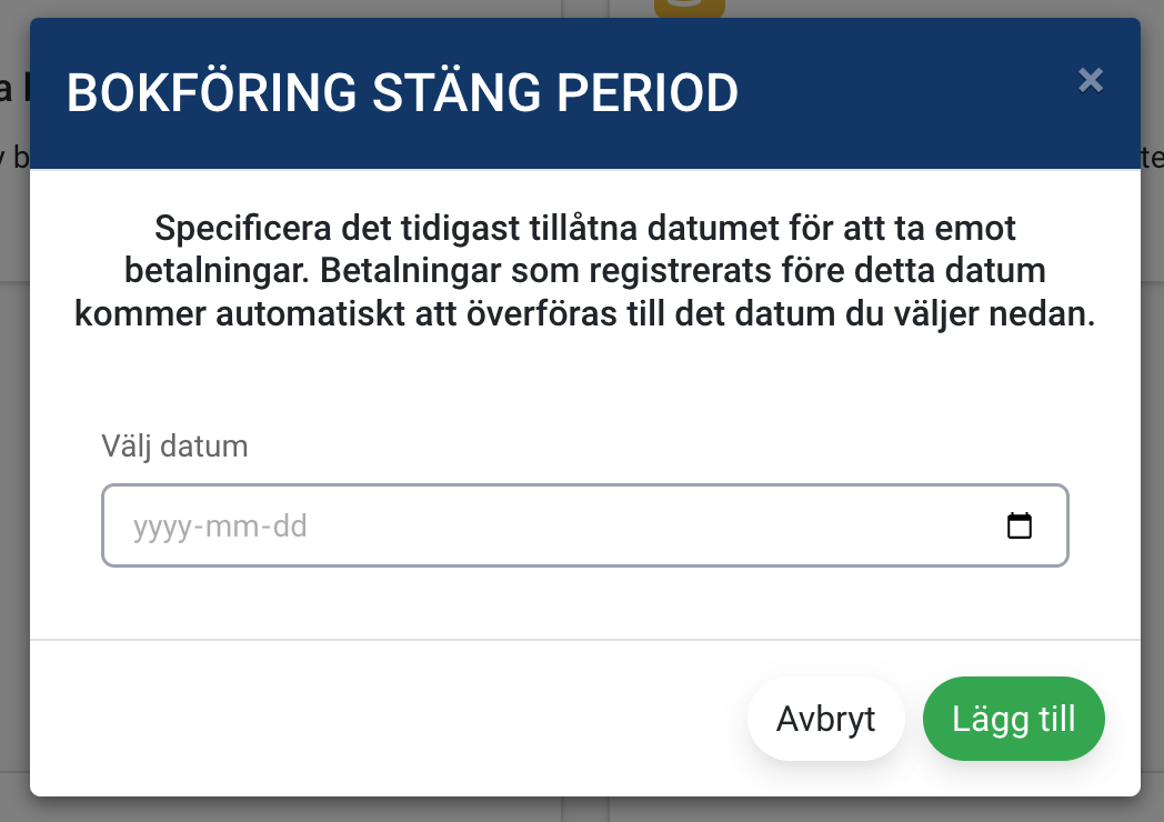 Eftersom inbetalningar oftast läses in med automation kan vi inte stoppa inbetalningar från att registreras. Det går dock att stänga en period genom att ange ett sista godkänt datum för registrering av inbetalning. Om det sedan kommer en inbetalning registrerad tidigare än detta datum så kommer inbetalningsdatum ändras till datum för periodstängning.