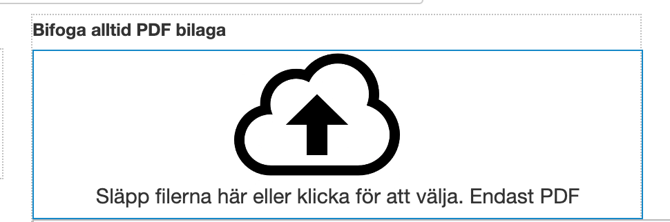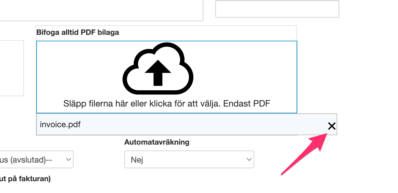 Endast PDF filer går att ladda upp. Så länge dokumentet ligger här på utställaren så kommer det skickas med fakturan.