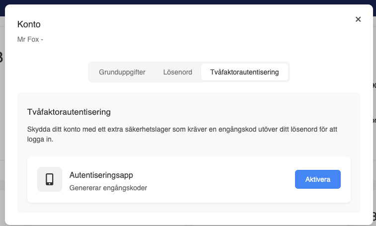 Användaren till kundportalen kan välja att säkra upp sin inloggning genom att gå till kontoinställningen, Tvåfaktorauthentisering och följa guiden för aktivering.