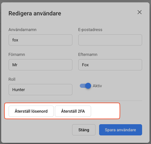 Skulle det bli problem för användaren att logga in till kundportalen så kan en handläggare återställa såväl lösenord som 2FA.