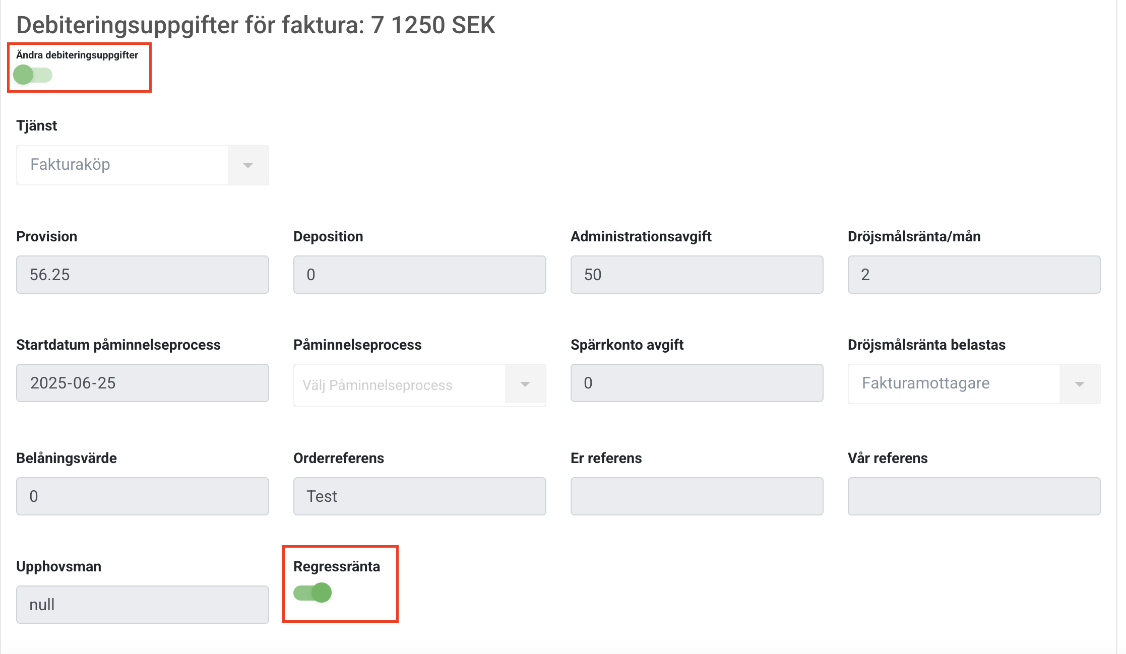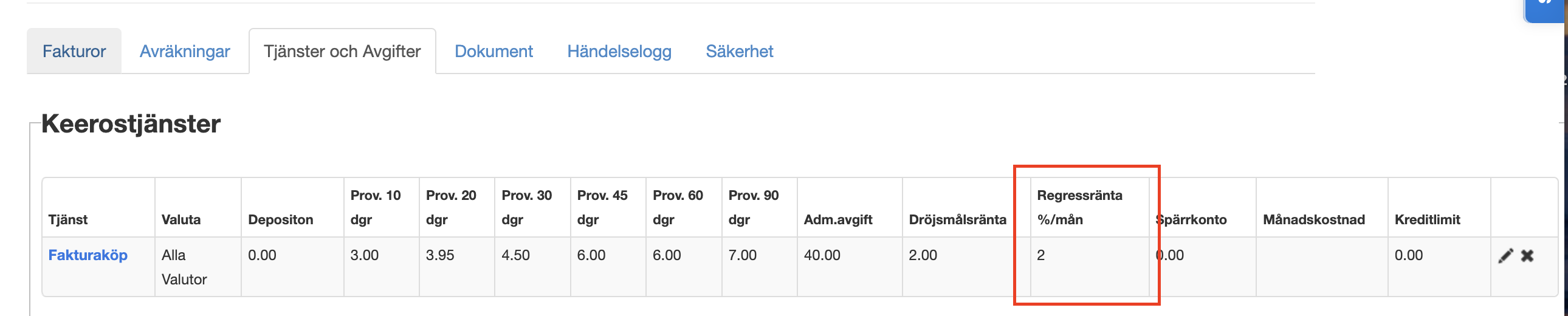 Du kan styra själv på fakturanivå om du vill debitera kunden regressränta eller inte. Detta gör du från avräkningsvyn innan den återförda fakturan avräknas och återdebiteras. Markera den aktuella fakturan och kryssa i eller ur rutan vid regressränta för att styra detta. Som vanligt måste du kryssa i rutan "Redigera debiteringskostnader" innan du har möjlighet att ändra värden i fakturadetaljer.