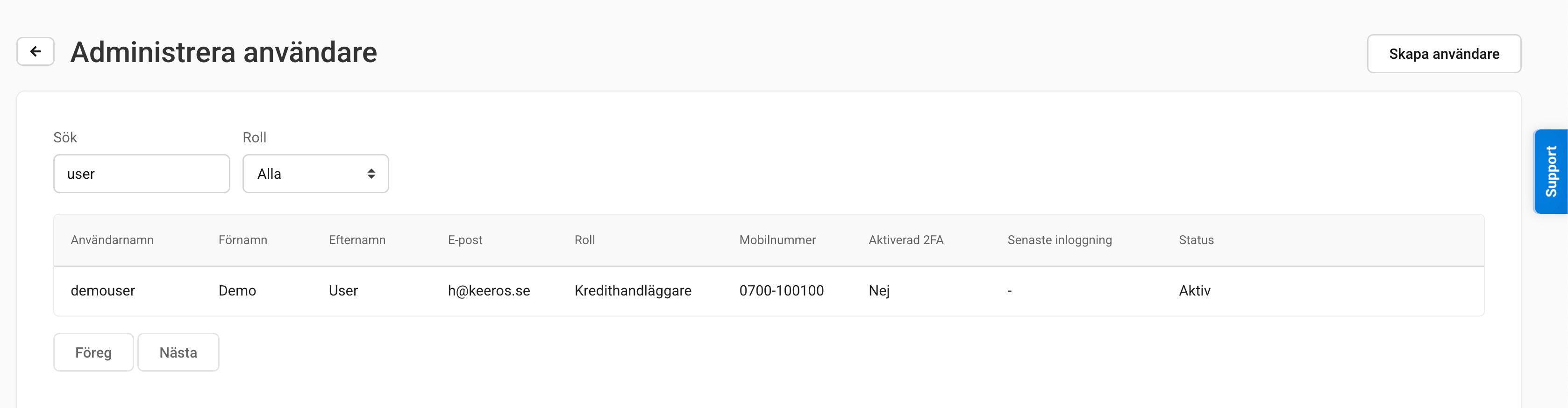 Gå till Administration -> Användare för att se en lista över alla konton. Det går att söka på användarnamn, förnamn och efternamn i sökrutan samt filtrera på roll. Listan visar också e-postadress, roll, mobilnummer, senaste inloggad tidpunkt samt aktiverat 2FA.